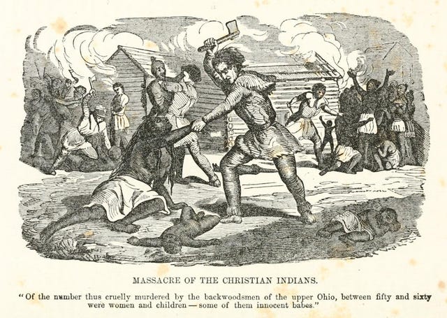 I had never heard of the Gnadenhutten Massacre. I grew up in Minnesota and never learned about it in school. It isn’t part of the current curriculum unless an individual teacher brings it up in an Advanced Placement (AP) course. I wasn’t surprised it isn’t required teaching in Florida, where I currently reside, or Texas, where the focus is on American Exceptionalism. I was surprised to find it isn’t required learning in Ohio, the State where it occurred, especially given who was murdered and who did the killing.